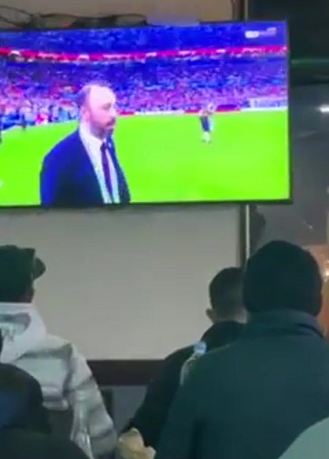 A group of people are sitting at tables watching a soccer game on a wall mounted TV. The game appears to be over or at a pause, as the coach of one of the teams is seen blowing a kiss and high fiving other players. The group of people are turned toward the TV, watching intently. The setting looks to be an indoor cafe or restaurant.