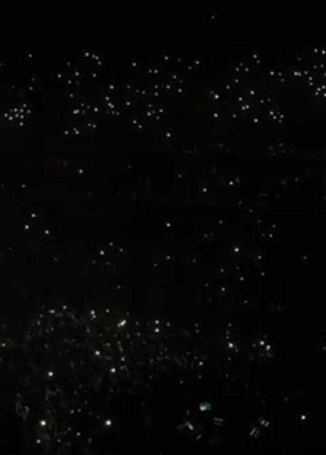 large crowd of people at what appears to be a concert. It is dark, with many audience members holding up their phones with the flashlights on, creating a starry effect. There is some movement within the crowd, and music can be heard.
