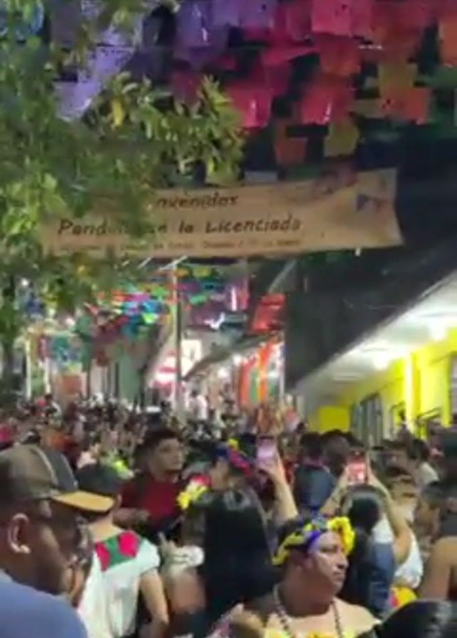 crowded street, possibly at night, decorated with colorful paper banners and lights. People are standing close together, some holding up phones to record the event. Many people are dressed casually, with some wearing traditional clothing or headwear. The street is lined with buildings, one of which is painted a bright yellow. A banner hangs above the crowd, but the writing on it is partially obscured. The scene suggests a lively festival or celebration.