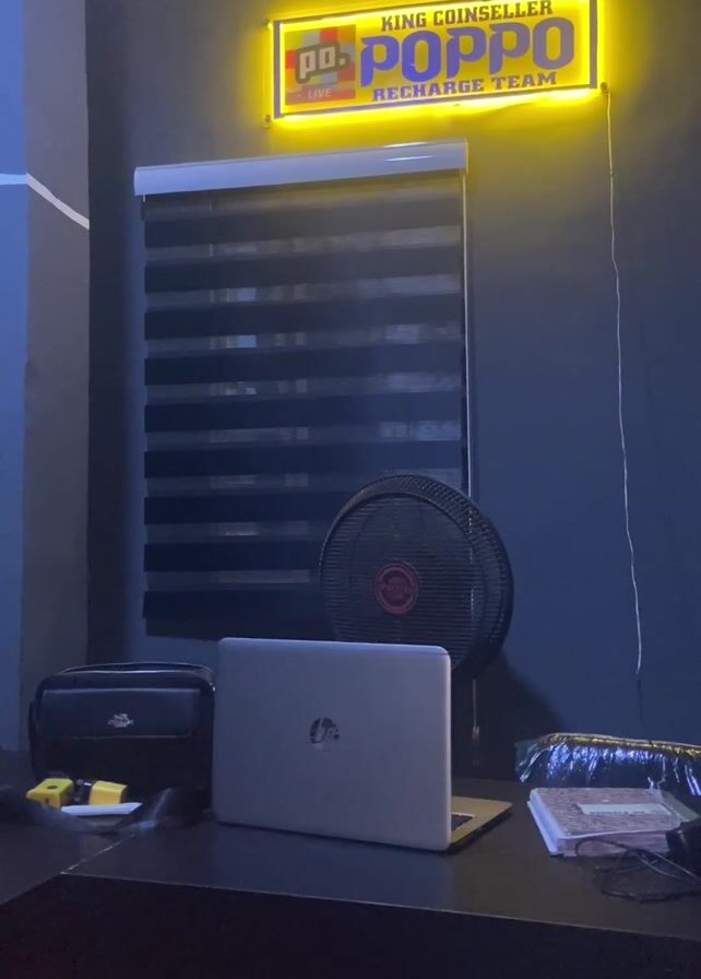 desk area with various items. On the desk is a closed silver HP laptop, a black bag, some small yellow objects, a fan, and a stack of papers wrapped in plastic. Behind the desk, there is a closed window with horizontal blinds. Above the window is a rectangular yellow light fixture that reads "KING COINSELLER, POPPO, RECHARGE TEAM" with the word "LIVE" in a small box. The walls are dark gray, with a white vertical stripe on the left side.