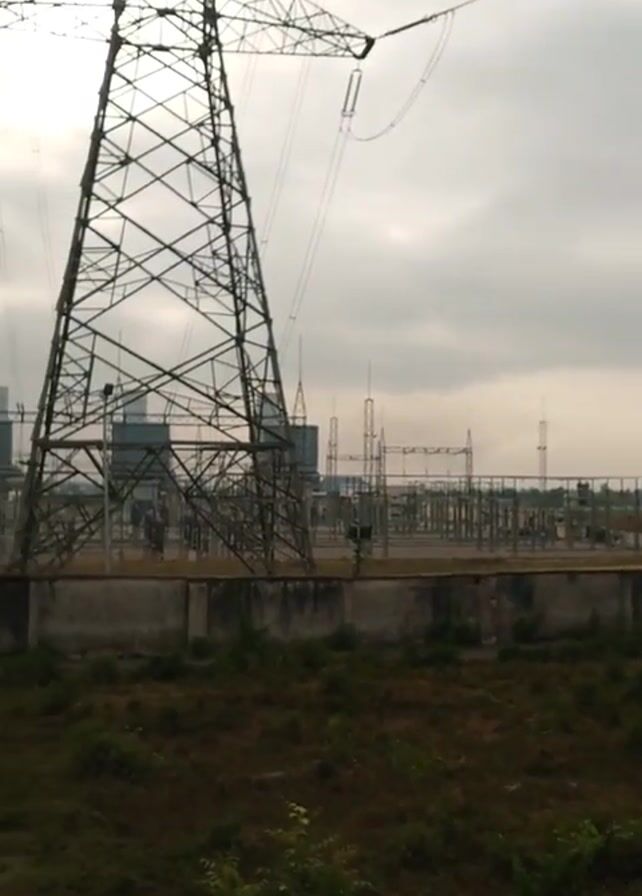n electrical power station under a cloudy sky. In the foreground, there is a tall power transmission tower made of interconnected metal beams. Behind the tower, and separated by a concrete wall, lies the power station itself, featuring multiple structures with electrical components and wires. Further in the background, there are three cooling towers with red and white striped tops. The ground in front of the wall is covered in overgrown grass and shrubs. The scene is static with no discernible activity.
