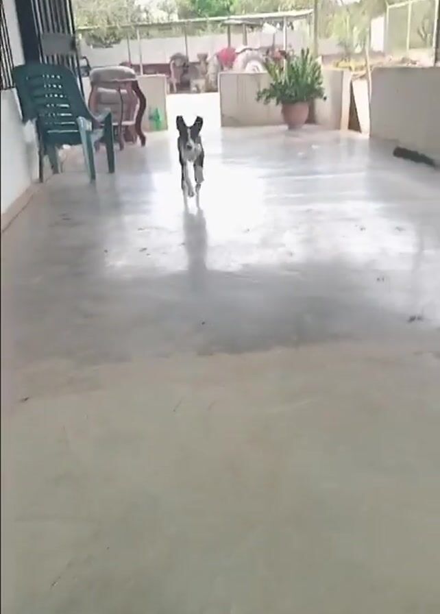A person wearing gray sweatpants is sitting on a chair on a porch with a concrete floor. A black and white puppy walks toward the person, and the person pets it and puts it on his lap. The puppy jumps around and runs away. Behind the person are various objects including a green plastic chair, an old metal barrel, and a yellow wheelbarrow.