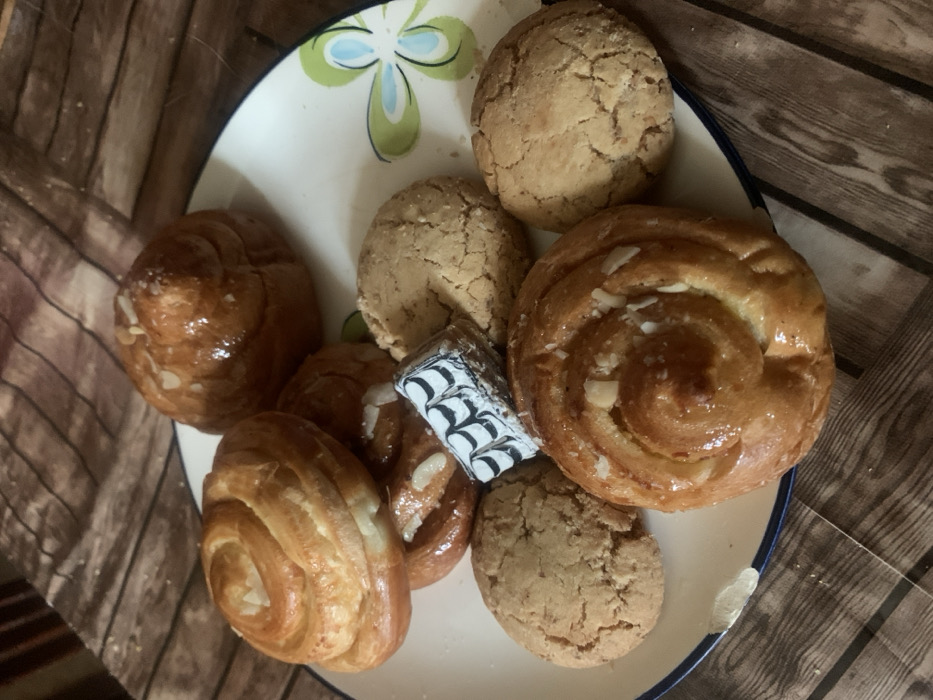 The scene is located in the city of Meknes, Morocco. The image presents a white circular plate laden with an assortment of baked goods and a single wrapped candy, situated on a surface covered by a brown and dark brown striped material, likely a tablecloth or placemat. The plate features a blue rim and a light green and blue floral design on its right side. Displayed on the plate are four golden-brown, spiraled pastries, some adorned with slivered almonds and a glazed finish. One additional, smaller, darker brown spiraled pastry is partially visible underneath others. Alongside these are three round, light brown cookies with a visibly cracked, crumbly texture. Centrally positioned among the items is a small, rectangular candy in a black and white patterned wrapper. No individuals or further contextual urban details are present in the visual frame.