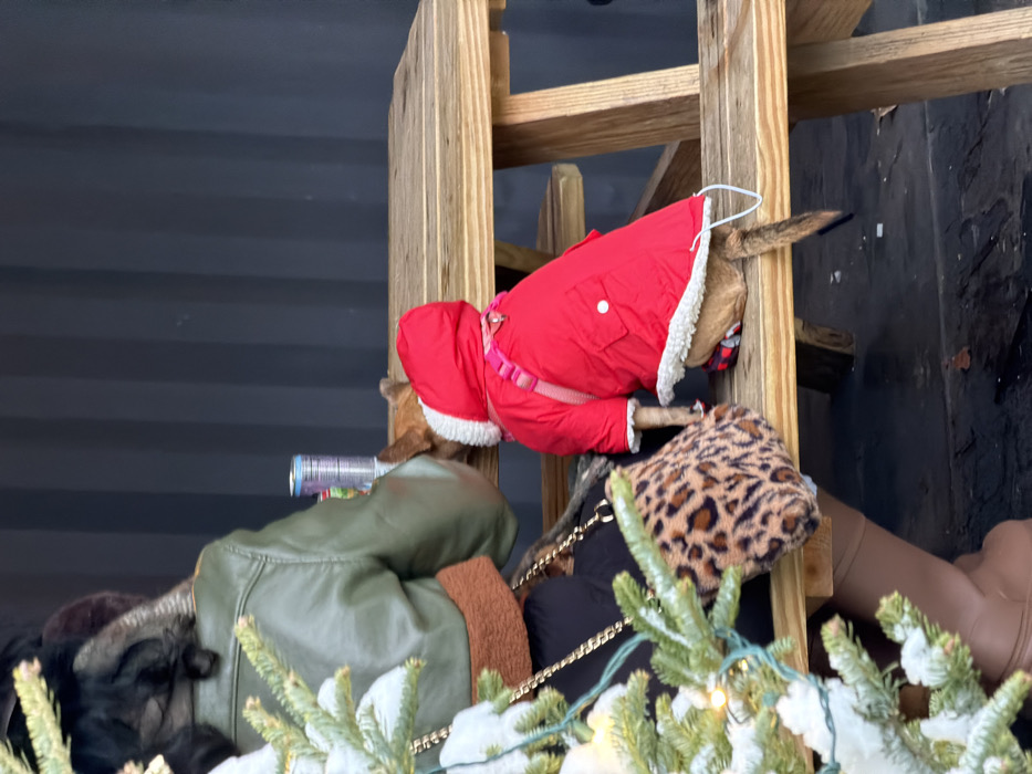 A mannequin donkey wears a red coat with white faux fur trim, positioned on a wooden ladder amidst a chaotic display
