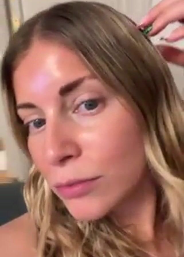 A woman with light brown hair and blue eyes is the main subject of a close-up video. She is indoors, and a white door with a brass handle is visible in the background, along with a potted plant. The woman is looking at the camera, and she uses a green hairpin to style her hair by clipping a section back. Her skin appears radiant, and she speaks.