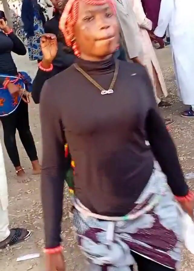 gathering of people outdoors. The ground is covered in dry leaves and other debris. A group of men in traditional white clothing stand in the background. Two women in black long-sleeved shirts and leggings, with patterned fabric wrapped around their waists and red beaded headbands, move in the foreground. One of the women is barefoot, while the other wears sandals. The women appear to be dancing or moving rhythmically within the crowd.