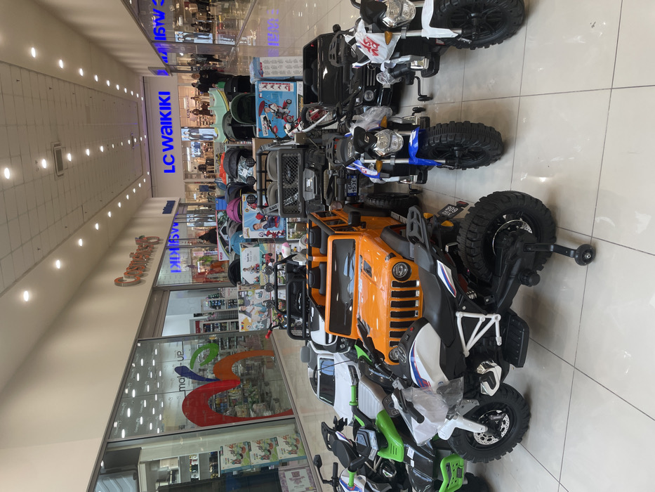 The image displays an interior view of a shopping mall corridor in Nikšić, Montenegro. The central foreground is occupied by a retail display of children's electric ride-on toys, including multiple motorcycles (white, blue), quad bikes (green), and jeep-style vehicles (orange, black, white). An orange ride-on jeep is prominently positioned. Several toys retain protective plastic wrapping or attached tags. Behind this primary display, additional boxed merchandise and several folded baby strollers are stacked. The mall features a light-colored, polished tiled floor and a white ceiling with numerous recessed circular lights. Storefronts line both sides of the corridor. On the left, a glass-fronted store with a "make-up" sign and a colorful "m" logo is visible, adjacent to a store labeled "Cosmetics." On the right, a storefront with a prominent blue "LC WAIKIKI" logo displays clothing merchandise. Multiple indistinct individuals are observed in the distant background, navigating the mall corridor or within the LC Waikiki store. No specific actions or interactions among these figures are clearly discernible.
