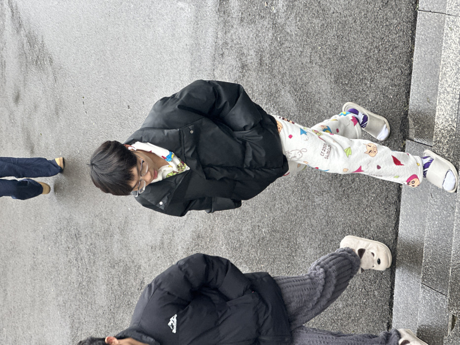 Two people stand outside. Both wear black puffer jackets and slippers. The person on the left wears white pants with cartoon prints and glasses. The person on the right wears grey knitted pants. A pair of legs in denim jeans and brown shoes are partially visible in the background. The setting is an urban outdoor space with grey pavement.