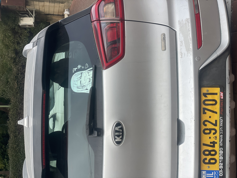 A silver Kia car's rear is shown. On the rear window, a cartoon girl sticker is visible. The car is a hybrid, indicated by a badge. The license plate, predominantly yellow, shows the number 684-92-701 and Israeli symbols. Contact information for "Perfect Car" is also on the license plate.