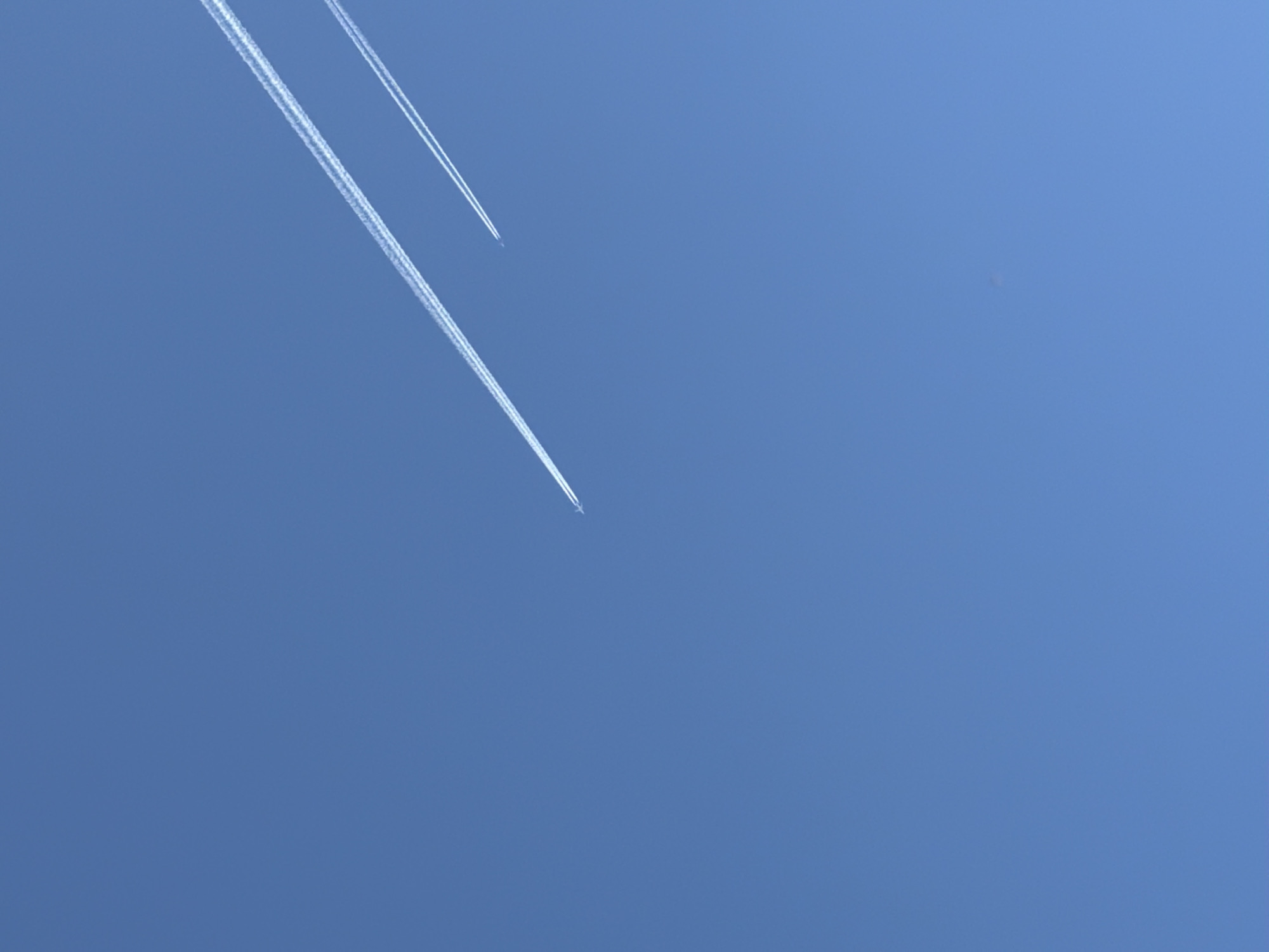 clear blue sky. Two contrails left by airplanes are visible in the upper left portion of the frame. The lower contrail is thicker and longer than the upper contrail. The location in Kokalyane, Bulgaria is irrelevant as there is no visible evidence in the photo to corroborate.