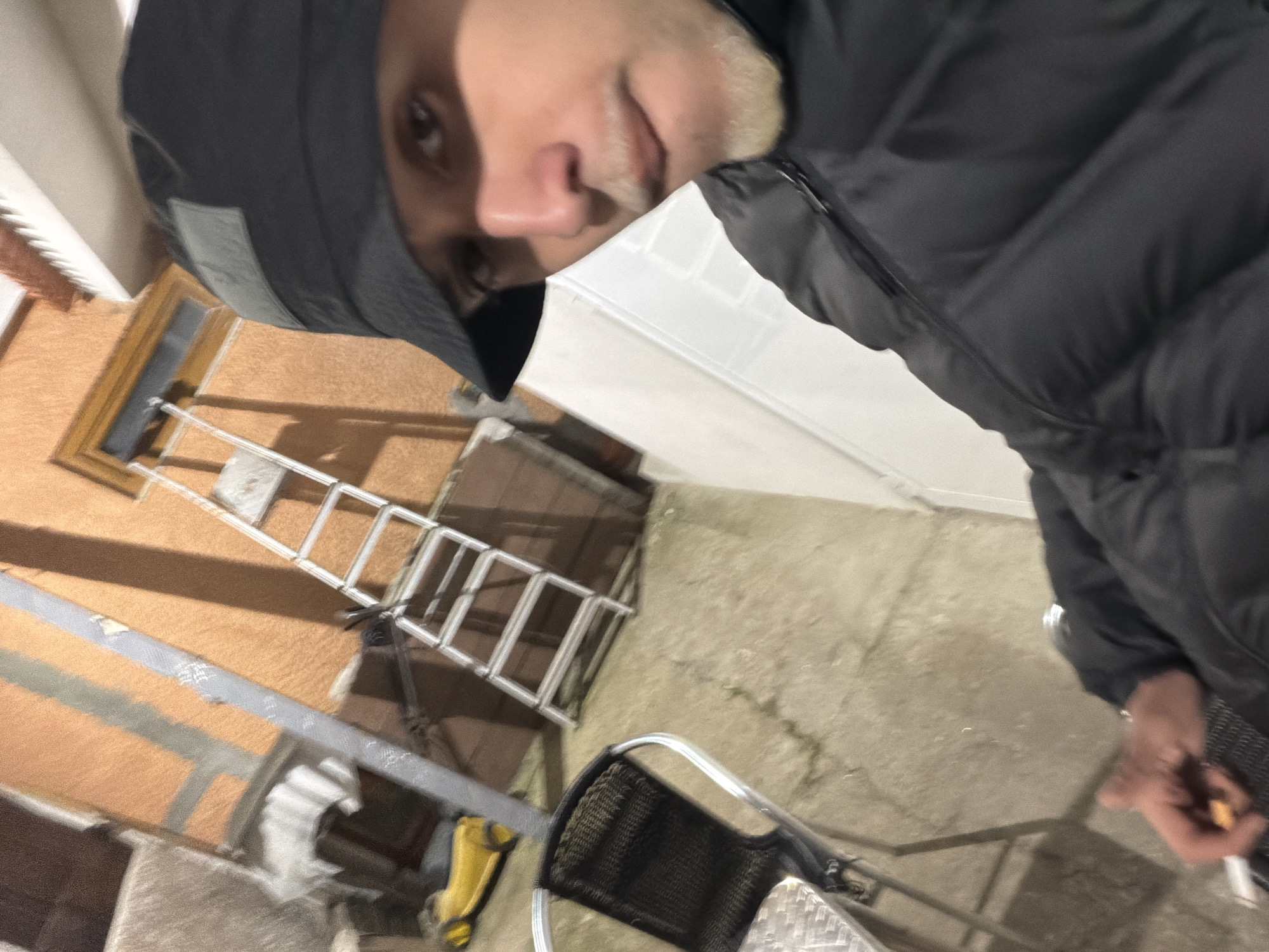 The image depicts a person in a black puffer jacket and a black hat, possibly a beanie, holding what appears to be a cigarette in their right hand. The background shows the exterior of a building with an orange-painted wall and a window with a gold frame. A metal ladder is leaning against the wall. There is a chair visible, and the ground appears to be concrete. Based on the available information, determining the exact location within Vila Real, Portugal, is not possible.