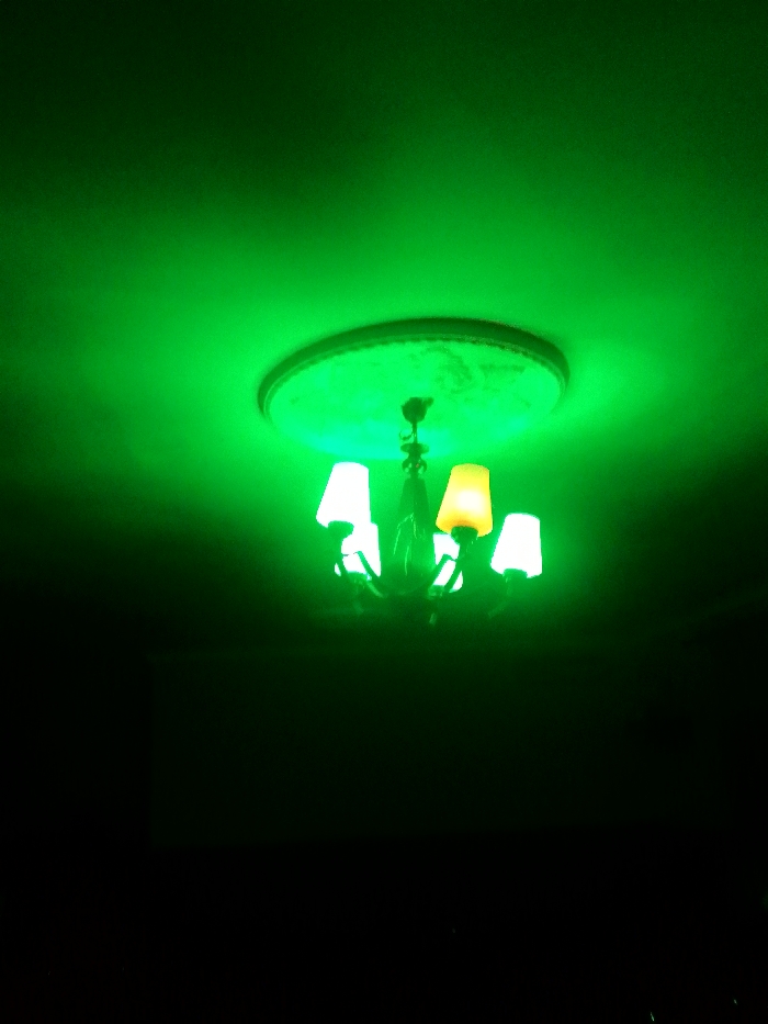 This image, captured in Ankpa, Nigeria, presents an indoor scene focused on a ceiling and a chandelier. The ceiling is uniformly illuminated by a strong green light, casting a distinct green hue across the upper frame. A circular, decorative ceiling medallion surrounds the central mounting point of a multi-armed chandelier. This chandelier features several lamp shades; at least one shade on the right emits a yellowish light, while others appear green due to the pervasive ambient light. The lower portion of the image is characterized by near-total darkness, obscuring any details below the chandelier's level. No individuals, actions, or interactions are visible within the frame.
