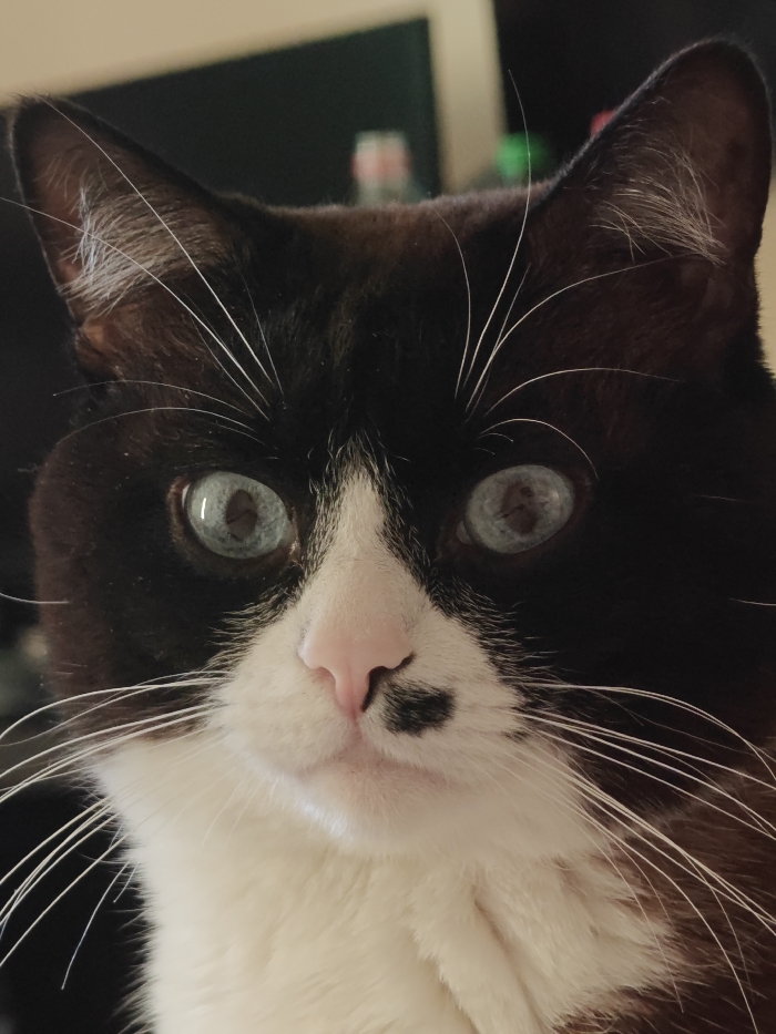 - "A close-up captures a black and white cat with striking blue eyes" by FM-eMutn2, licensed under CC BY 4.0