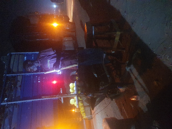 A man in a maroon shirt stands on a truck, illuminated by the truck's red taillight and a bright yellow light. He holds a glowing stick, possibly lighting something. Behind him, a dark-colored SUV is visible. The foreground is dark and undefined, possibly a street or road. The scene is set at night, with the primary light sources being artificial. A chair is placed near the car. There are yellow objects next to the man.