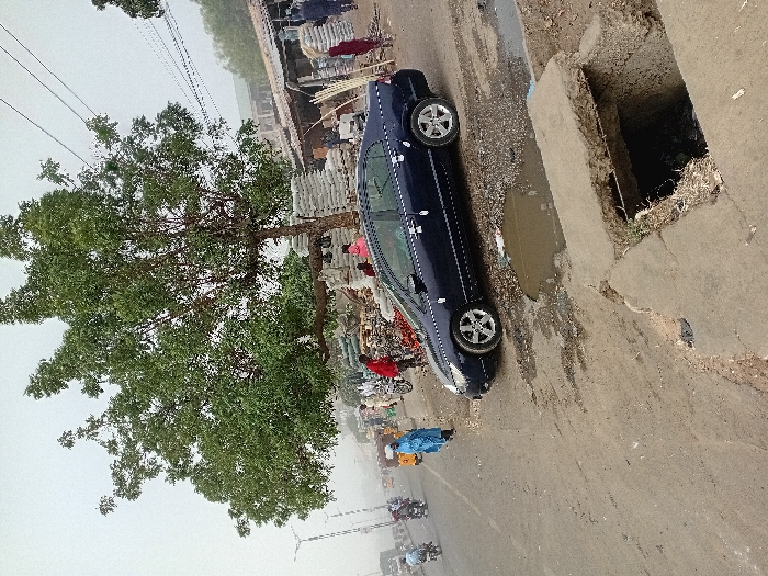 The image depicts an urban street scene in Sharada, Nigeria, under hazy, overcast conditions. In the foreground, a dark blue, four-door Honda Civic sedan is parked curbside, facing away from the viewer. Adjacent to the vehicle, the asphalt road surface is damaged, featuring a significant pothole filled with murky water. To the immediate right, an open concrete culvert or drainage channel with visible debris is present. A large tree with dense green foliage dominates the mid-ground, extending over a bustling market area. Beneath and around the tree, numerous large, white sacks, consistent with cement or construction aggregate, are stacked. Various building materials, including rebar and wooden poles, are visible further right. Multiple individuals are present: a person in a light blue robe stands on the left roadside, while another in a red shirt is near the stacked bags. Additional figures are observed in the background market area, some appearing to carry objects on their heads. The street to the left shows active traffic, with several motorcycles and a three-wheeled auto-rickshaw. Overhead power lines crisscross the upper portion of the scene. In the distance on the left, two streetlights with multiple fixtures are visible, partially obscured by the haze. The background features various urban structures, likely market stalls with corrugated metal roofs.