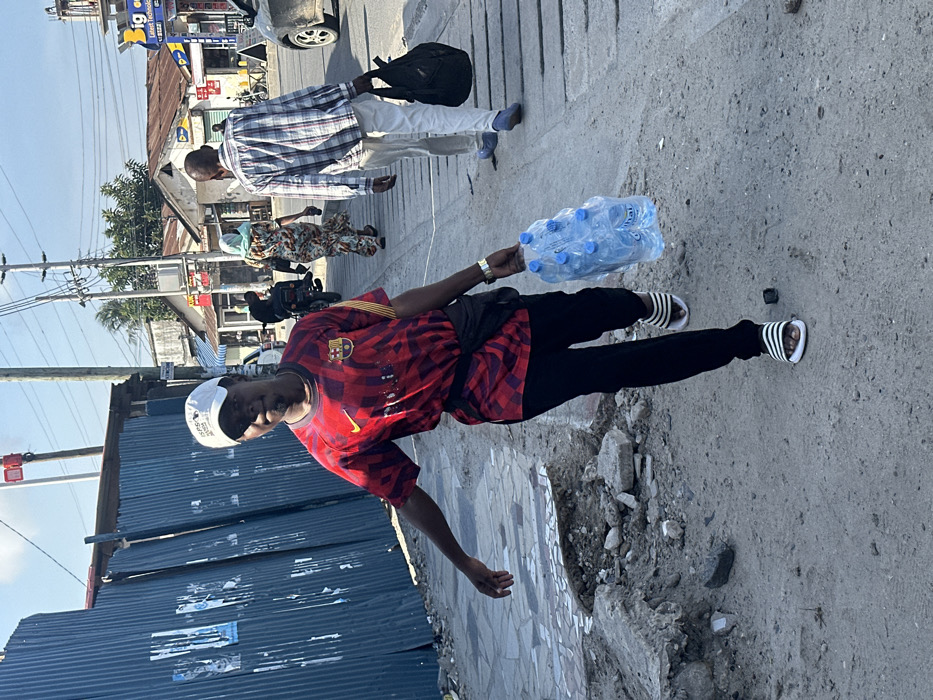 This image depicts an urban street scene in Dar es-Salaam, Tanzania, under clear daylight conditions. The primary subject, a dark-complexioned male, is positioned in the foreground, facing towards the viewer. He wears a white baseball cap, a red and black FC Barcelona soccer jersey, black pants, and white-striped slide sandals. A black fanny pack is worn around his waist. In his right hand, he holds a clear plastic bundle containing six small water bottles. His left arm is slightly extended to the side. He is walking on a concrete sidewalk, portions of which are damaged, exposing dirt and rubble. In the midground, two additional individuals are seen walking away from the viewer on the same sidewalk. One, a person in a patterned long dress and a light-colored head covering, walks ahead. Behind them, a male wears a light plaid long-sleeved shirt, light pants, and blue footwear, carrying a black bag in his left hand. To the left of the scene, a tall barrier constructed from corrugated blue metal sheets defines the edge of the sidewalk. In the background, across a paved street, several low-rise commercial buildings with varying architectural styles and corrugated roofs are visible. Overhead, utility poles with multiple wires traverse the scene. A yellow "Big G Internet Technology" sign is prominent on a building to the right. A motorcycle is partially visible behind the main subject, and a light-colored car is on the street to the far right. The environment is consistent with an active urban commercial or residential thoroughfare.