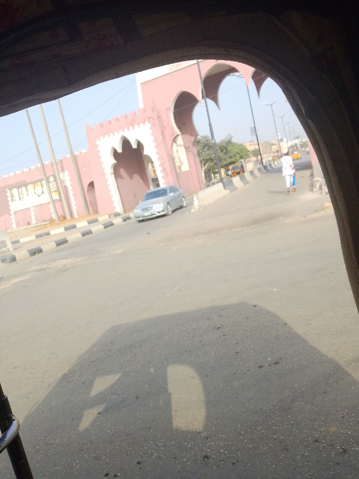 A pink building with crenellations and arched gateways stands beside a road. A silver car is parked in front. A pedestrian in white walks to the right. Streetlights line the road ahead. The view is framed by the interior of a vehicle, casting a shadow on the asphalt. A blurred vehicle interior partially obscures the top of the frame.
