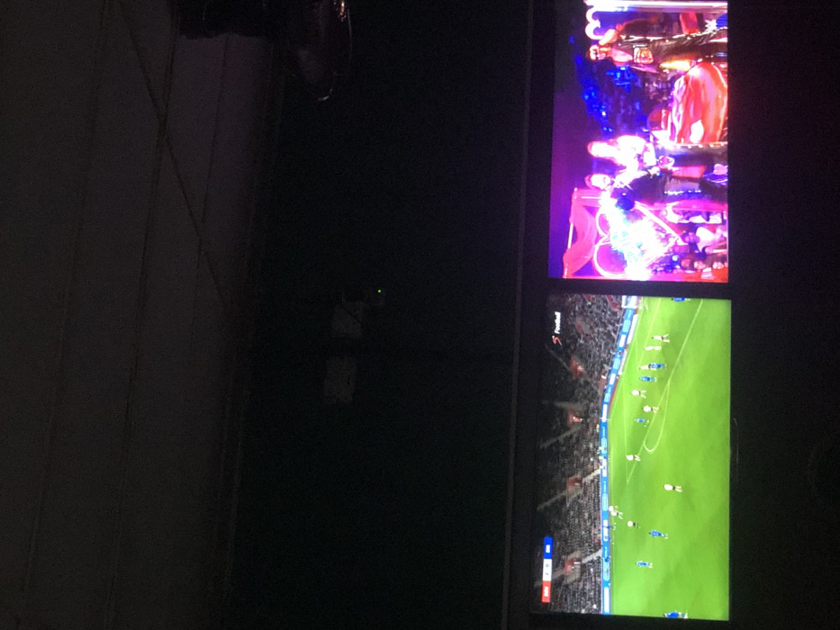 Two stacked screens are displaying content. The top screen shows a brightly lit crowd at what appears to be a concert. The bottom screen shows a football (soccer) match in progress on a green field, with players visible and stadium seating in the background. A room fan is visible in the top-left of the image.