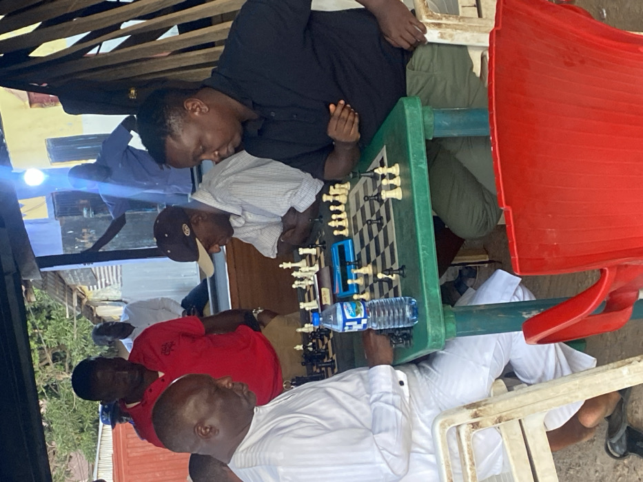 The image captures an outdoor chess gathering in Jos, Nigeria, featuring multiple adult males engaged in or observing chess games