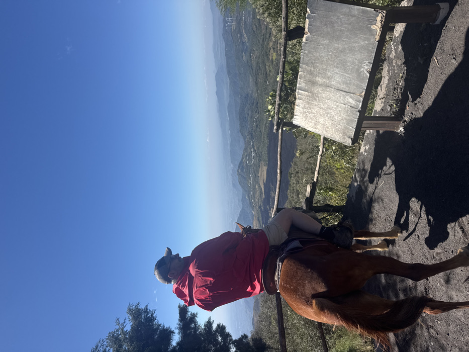 A man wearing a red jacket and hat is riding a brown horse. The horse is standing on a dirt path next to a wooden fence and a weathered wooden sign. Behind the fence, there is a view of a valley with green trees and mountains in the distance. The sky is blue and clear. The sun appears to be shining brightly. The photo is slightly rotated to the right.