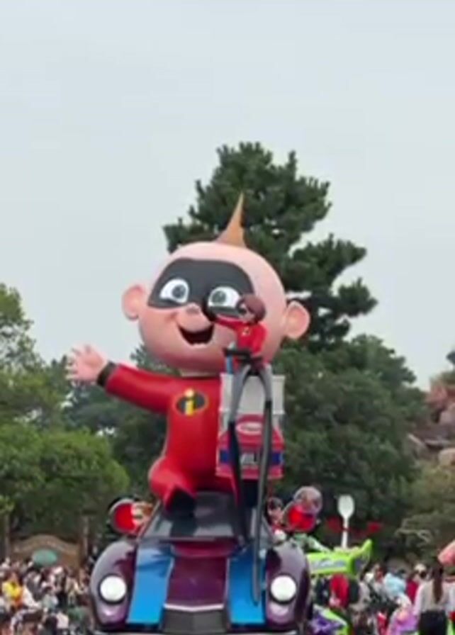 A float in a parade is seen moving towards the camera. The float has a blue and purple car-shaped bottom. A very large, bobble-head style, plastic Jack-Jack from “The Incredibles” sits on top of the car. He is wearing his red superhero suit and mask, and has his hand up in a wave. A tiny, animatronic Mr. Incredible is standing behind him operating a gas pump filling up a container of milk. A crowd of people is seen in the background, sitting and watching the parade. Several trees can also be seen.