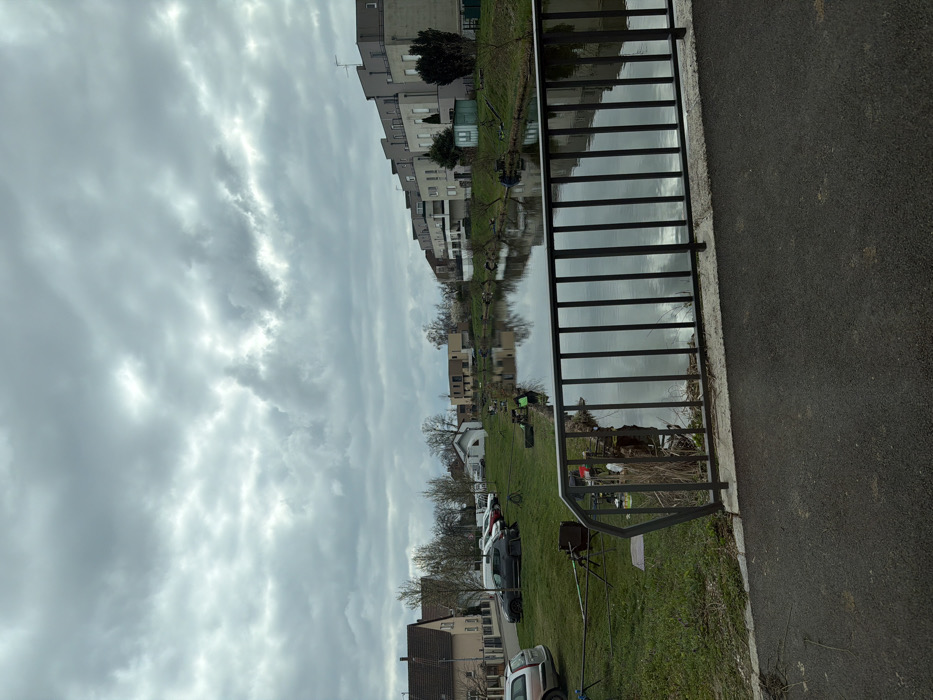 The image depicts a tranquil urban waterway, identified as a river or canal, in Eschau, France, on an overcast day. The scene is observed from a bridge or elevated path, with a dark, vertical-barred metal railing prominent in the foreground. The sky is largely covered by diffuse grey clouds. Along both grassy banks of the water, several individuals are engaged in fishing. On the left bank, at least two fishing setups are visible, each consisting of multiple rods positioned on tripods or stands, accompanied by chairs. A silver station wagon and several dark-colored sedans are parked on the grassy area adjacent to a paved road on this bank. Further left, a traditional-style house with a reddish-brown tiled roof is partially visible, while more modern buildings are present further back. On the right bank, similar fishing setups with rods and chairs are observed. At least two distinct fishing stations are identifiable, with figures seated near the water's edge. This bank is lined with a row of modern, multi-story residential buildings featuring light-colored facades and balconies, reflecting in the calm water. Sparse trees and bushes are interspersed along both banks. The water itself is dark and reflects the cloudy sky and the surrounding buildings.