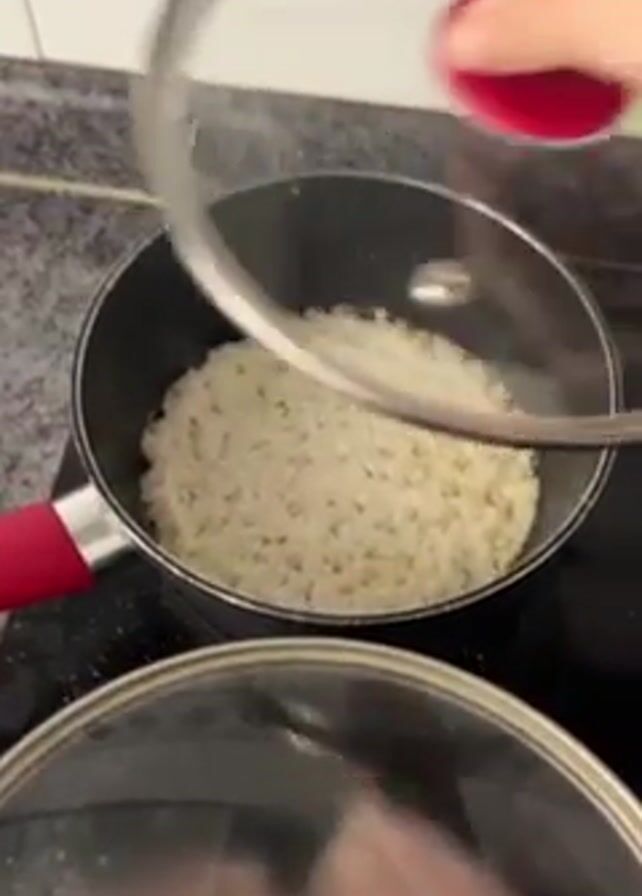 The video begins with a close-up shot of a black pot filled with a white, granular substance, possibly cauliflower rice, sitting on a black stovetop