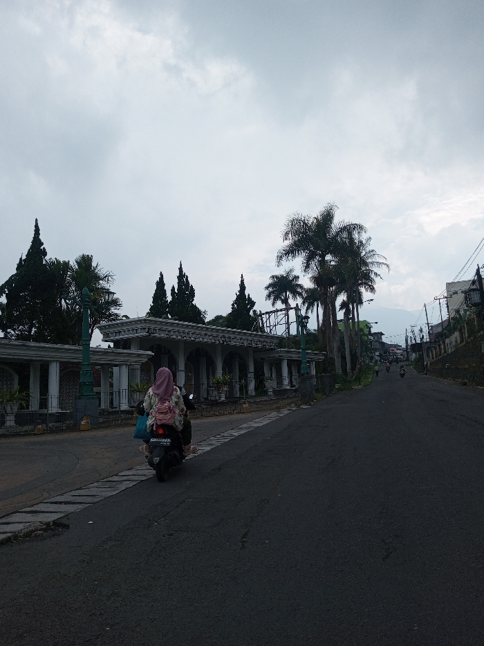 A street scene shows a scooter with two people, viewed from behind, driving on the left side of the road. The road is dark and wet. A white architectural structure with pillars and arches lines the left side of the road. Tall trees, including palms, are present. Buildings are visible on the right side of the road. The sky is overcast and gray. Another scooter is seen further up the road.