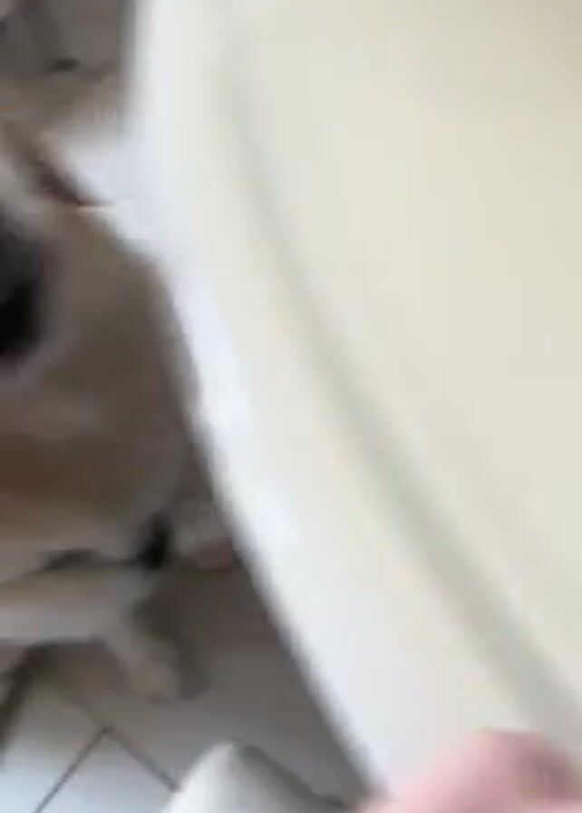person eating breakfast while being watched by a golden retriever. The breakfast plate contains an open-faced sandwich with ham and cream cheese and a fried egg with feta cheese and tomatoes. The person uses a fork to eat. The dog sits patiently, looking up at the person and the food. The scene takes place in a room with white furniture and white tile flooring.