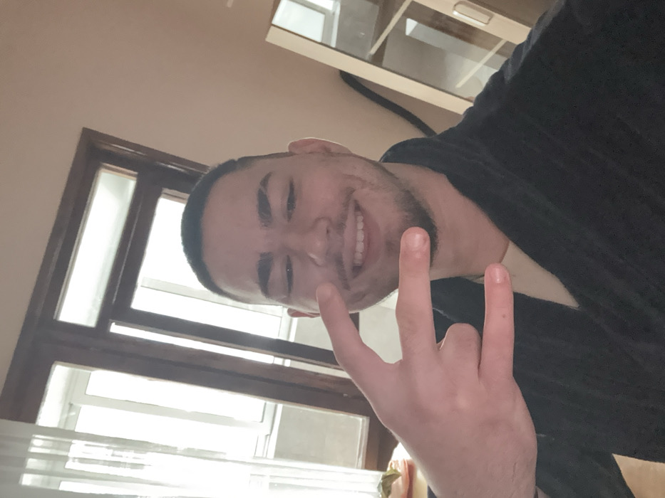 An indoor scene within a residential or hotel room in Yambol, Bulgaria, features a light-skinned male subject, approximately 20-30 years old, centered in the frame. He has short dark hair, a short beard, and a mustache. The subject is smiling broadly, revealing upper and lower teeth, and looks directly at the camera. He is wearing a dark, possibly navy or black, textured robe over a lighter-colored undershirt. His left hand is raised to chest height, forming a "rock and roll" gesture with the index and pinky fingers extended and the middle and ring fingers curled under the thumb. In the background to the subject's left, a window with dark-framed panes is visible, covered partially by sheer white curtains, allowing bright daylight to enter. Below the window, a light-colored dish or plate containing an indeterminate item is partially visible on a surface. To the subject's right and rear, a light-toned wooden cabinet or shelving unit with multiple open compartments is present. A dark, flexible tube or cable runs vertically behind the cabinet. The walls of the room are a light, warm neutral color.