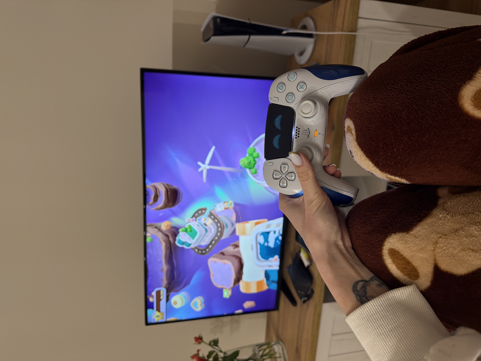 A person is holding a white and blue PlayStation 5 DualSense controller in front of a television displaying a video game with a cartoonish aesthetic. The game features a colorful, floating landscape with various structures and elements. The controller is partially obscuring a large, brown stuffed animal. In the background, a PlayStation 5 console is visible on a wooden surface. Below the television, there is a vase with red roses. The overall setting appears to be an indoor environment.