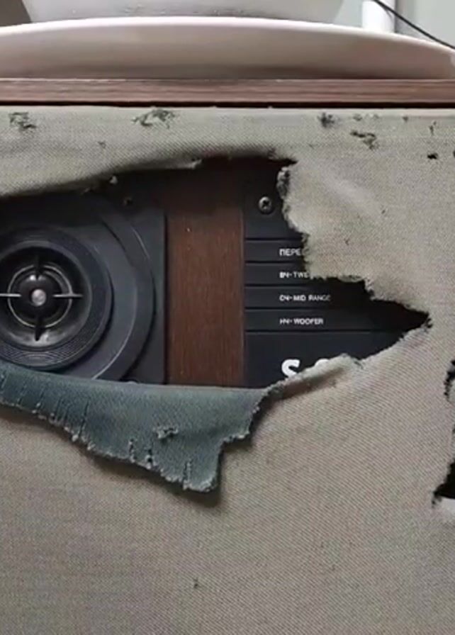 close-up shot of a worn-out vintage speaker with a torn cloth cover. The speaker has a wooden frame and what appears to be a tweeter visible through the tear in the fabric. There are adjustments visible as well. The speaker sits under a white plate. Music is playing.