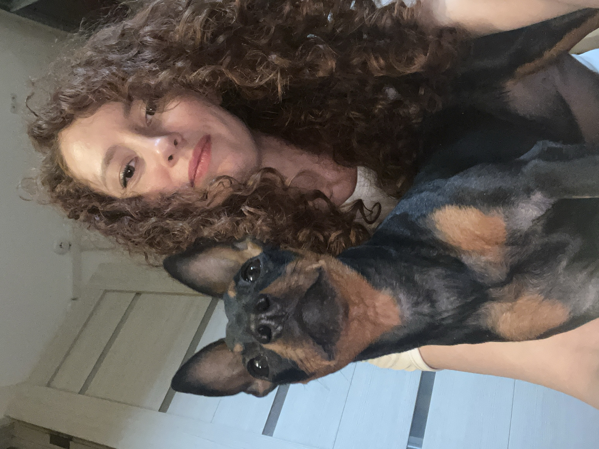 A woman with curly brown hair and fair skin is holding a black and brown dog with pointed ears. The woman is looking at the camera with a slight smile. The dog is also looking at the camera. The background is blurry and appears to be a room with light-colored walls and a door. The location is not discernible as Saint Petersburg, Russia, based on the provided image.