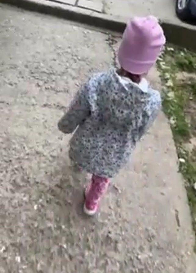 A young child walks up a sloped concrete surface. The child is wearing a pink knit hat, a gray floral jacket, pink patterned leggings, and pink and white shoes. The child is viewed from behind and walks away from the camera. To the right, there is some patchy grass and a discarded white tile. To the left, there is a gray car parked near some concrete steps. The child navigates the slightly uneven concrete as they ascend the slope.