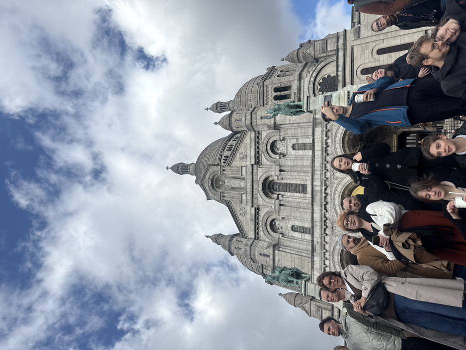 The image depicts a crowded gathering of approximately 25 individuals on the steps or viewing platform directly in front of the Basilica of Sacré-Cœur, located in Montmartre, Paris, France
