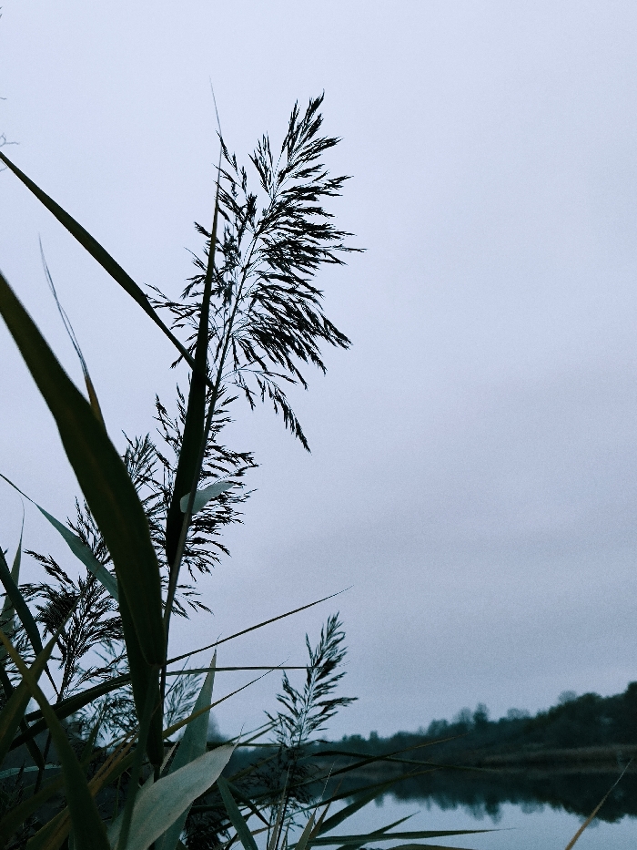 The image captures a natural outdoor scene in Parkhomivka, Ukraine. The foreground is dominated by tall, slender reed plants (likely Phragmites australis) with long, dark green leaves and prominent feathery seed heads, which appear as dark, intricate silhouettes against the lighter sky. These reeds occupy the left and lower portions of the frame, some extending diagonally upwards and others forming a dense cluster. In the midground, a calm body of water, reflecting the overcast sky, extends horizontally across the frame. The water surface is still, showing no discernible ripples. Along the far bank of the water, a distant line of dark, indistinct trees or shrubs forms a low, muted horizon. The upper two-thirds of the image consists of a uniformly light grey, overcast sky, indicating cloudy weather conditions. No human presence, animal life, or artificial structures are visible within the depicted area. The scene is static, devoid of active subjects or interactions.