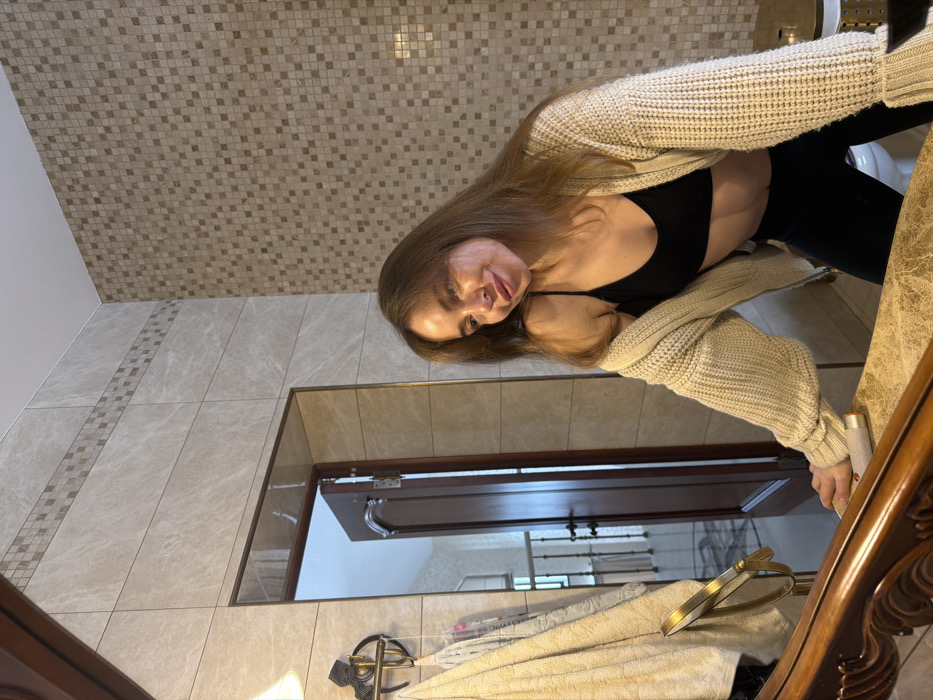 The image displays a female individual capturing a mirror selfie within an indoor bathroom or vanity setting. The subject, a woman with long, light brown hair, is positioned with her right hand resting on a mottled light-colored stone countertop, which is framed by a decorative dark wooden edge in the foreground. She is wearing a black spaghetti-strap crop top, exposing her midriff, underneath an unzipped, loose-fitting, light beige knitted cardigan. She exhibits a subtle smile and directs her gaze slightly to the viewer's right. A small, silver-colored cylindrical object rests on the countertop to her left. The background features tiled walls. The wall section to the left consists of large rectangular beige tiles with a marble-like pattern, horizontally segmented by a decorative strip of smaller, square mosaic tiles. The wall section to the right is entirely covered with small, uniform square mosaic tiles in shades of beige and brown. Reflected in the mirror on the left, a brass-toned wall sconce with a white conical shade holds two draped towels, one cream and one white with a pattern. Beyond this fixture, an open dark brown door reveals a hallway or adjacent room featuring a white banister and patterned wallpaper. A white toilet fixture is partially visible in the reflected background, positioned behind the subject's lower body. The environment is well-lit and appears to be a private residence. The specific location in Mishutkino, Russia, cannot be determined from the visual information present in the image.