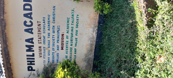 The image displays a cream-colored exterior wall of a building in Chevaywa ward, Kenya. Prominently painted in large black capital letters across the upper portion of the wall is "PHILMA ACADEM," with the final letter partially obscured by foliage. Below this, a "VISION STATEMENT" is painted in dark brown, followed by blue text reading: "TO PRODUCE GREAT SCHOLARS WHO WILL SCALE THE ACADEMIC HEIGHTS OF SOCIETY WITH CHRISTIAN VALUES AND PRINCIPLES." Below the vision, a "MISSION:" is painted in dark red, followed by green text stating: "BE A CENTRE OF ACADEMIC EXCELLENCE NURTURING TALENTS, SKILLS AND VALUE FOR SOCIETY." The wall exhibits weathering, including discoloration, patches of dirt, and areas where paint has flaked off, particularly in the lower-middle section. A dark blue or black painted strip runs horizontally along the bottom of the wall, where it meets the ground. A corrugated metal roof edge is visible along the top of the structure. The foreground is dominated by dense, unkempt green vegetation, including various grasses and leafy plants. A substantial green bush is present on the left side, partially obscuring the wall and text. Smaller green foliage grows along the base of the wall on the right. The scene is illuminated by natural daylight. No individuals, active subjects, or direct interactions are depicted.