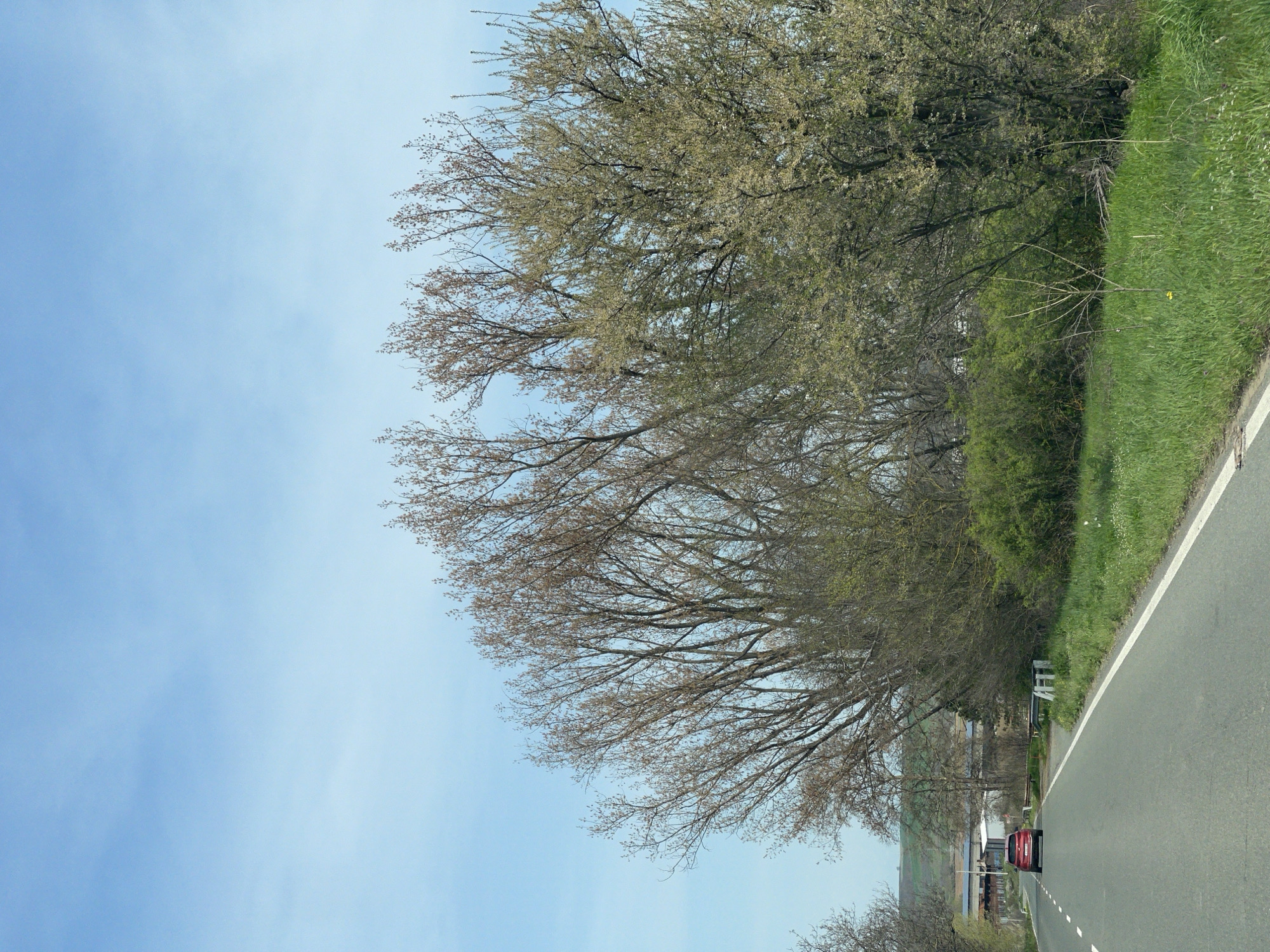 An eye-level shot shows a rural road in Sredets, Bulgaria. A red car travels on the asphalt road. A green grassy verge is on the right. Bare trees line the road. The sky is blue with clouds.
