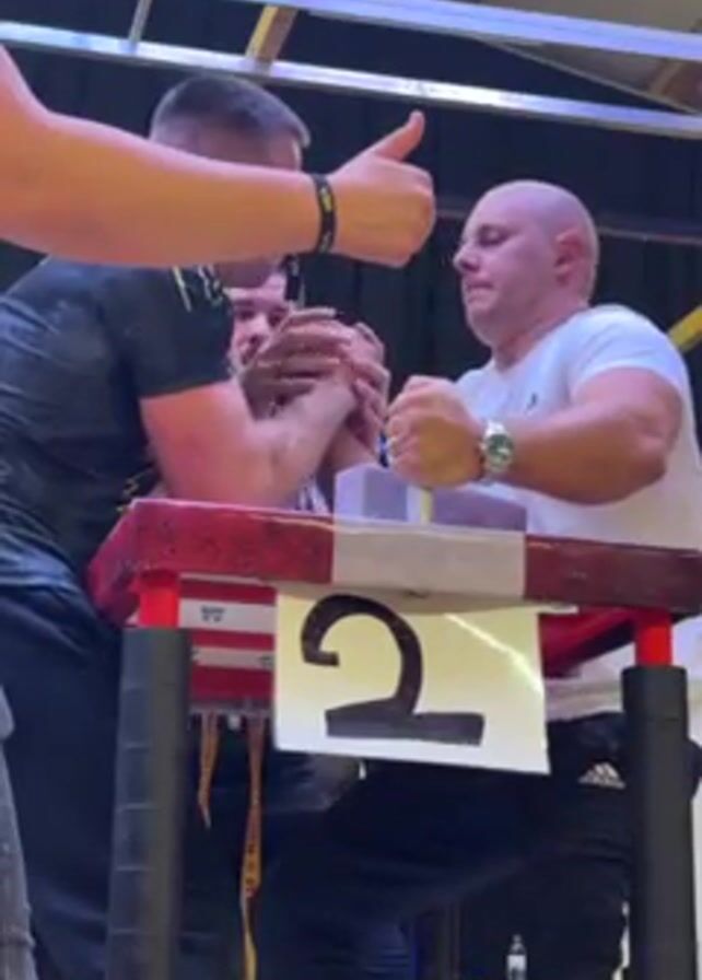 two men arm wrestling. One man has dark hair and a dark printed shirt and is on the left. The other man has a shaved head and a white shirt and is on the right. There is a referee in a striped shirt standing between them. They are arm wrestling on a red table with a large number 2 on it. The environment appears to be some sort of competition hall with a high ceiling. The man in the white shirt is struggling to win.