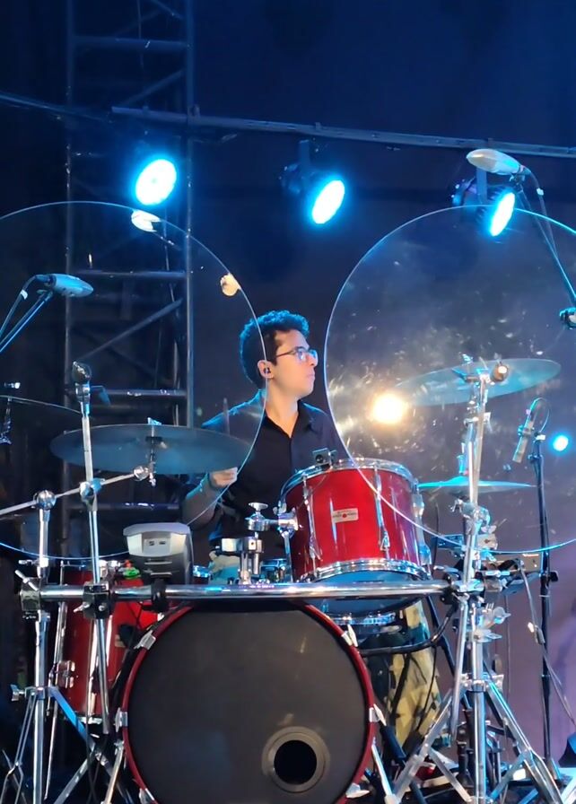 A stage performance shows a male drummer with glasses and wearing a black shirt, seated behind a red and black drum set