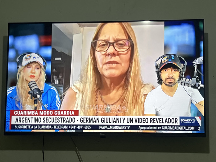 A television screen displays a broadcast titled "Guarimba Modo Guardia" addressing the kidnapping of Argentinian German Giuliani, and a revealing video