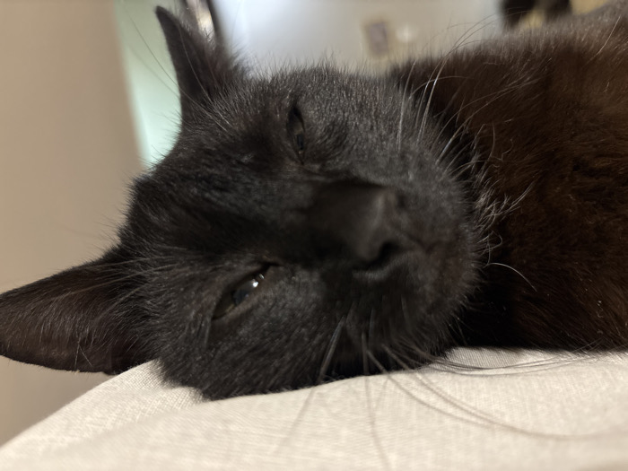 - "A domestic black cat is depicted in a close-up, horizontal orientation, resting on a light-colored, textured fabric surface" by FM-naVU72, licensed under CC BY 4.0