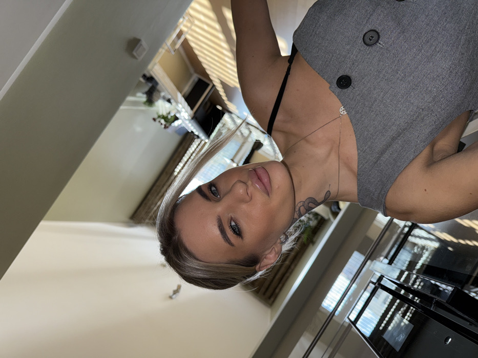This image depicts a single female subject in a selfie-style pose, located within an indoor private residence in Berlin, Germany. The subject presents with fair skin, light blue eyes, prominent lips, and light-colored hair partially pulled back with strands framing her face. A stylized serpent tattoo is visible on the left side of her neck/jawline. She wears a grey sleeveless top or dress featuring three black buttons vertically aligned on the right chest area, with a black bra strap visible on her left shoulder. A slender silver-colored necklace with a small, circular pendant is also worn. The background shows a contemporary living space with light-colored walls and ceiling. Natural light enters from windows, creating distinct horizontal shadow patterns on the right, consistent with light passing through window blinds. On the far right, a dark console table or shelf holds a vase with flowers and other decorative items. On the far left, reflective dark surfaces consistent with modern kitchen appliances or cabinetry are visible. Overhead lighting fixtures are present on the ceiling in the upper left portion of the image.