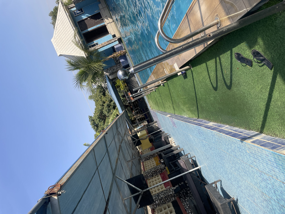 This image depicts an outdoor poolside area under a clear blue sky, reportedly located in Numan, Nigeria