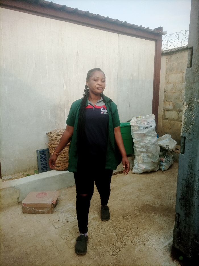 A woman walks in a courtyard. She has dark hair and is wearing black pants, dark shoes, and a shirt with a green button-down shirt over it. To her left is a wicker basket and a sign that says "COLD ROOM." To her right are two large bags, a green trash can, and a concrete wall topped with barbed wire. The courtyard floor is made of concrete.