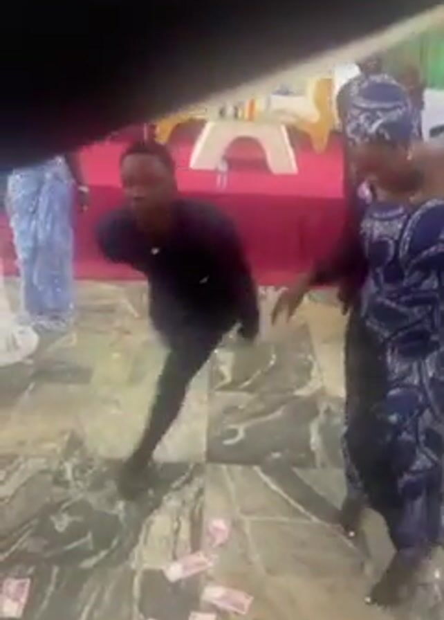 man performing a headstand on a tile floor covered with scattered banknotes. The man then stands up and continues to dance in place. The man is wearing a long-sleeved black shirt and dark pants. Behind the dancing man are other people dressed formally, and a raised platform with seating and several bottles on it.