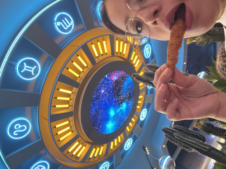 The scene is located within the Planetarium Fast Food & Snack restaurant in Mondeville, France. A female subject is captured in a close-up, holding a single, golden-brown, breaded fried food item with her right hand, positioning it towards her open mouth. She wears round-framed glasses. The background features the restaurant's unique ceiling structure: a circular, multi-tiered design. The outermost visible ring displays blue neon zodiac symbols, including Capricorn, Gemini, and Virgo. An inner ring is illuminated by multiple vertical yellow light tubes. The central circular panel of the ceiling projects a vibrant image of a galaxy with blue and purple nebulae. Several tall, dark green cacti and spherical, glowing light fixtures are present in the mid-ground, consistent with the establishment's futuristic, space-themed decor.