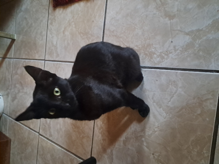 - "An indoor scene in Mitchells Plain, South Africa, features a single black cat positioned centrally on a light-colored tiled floor" by FM-itX5C3, licensed under CC BY 4.0