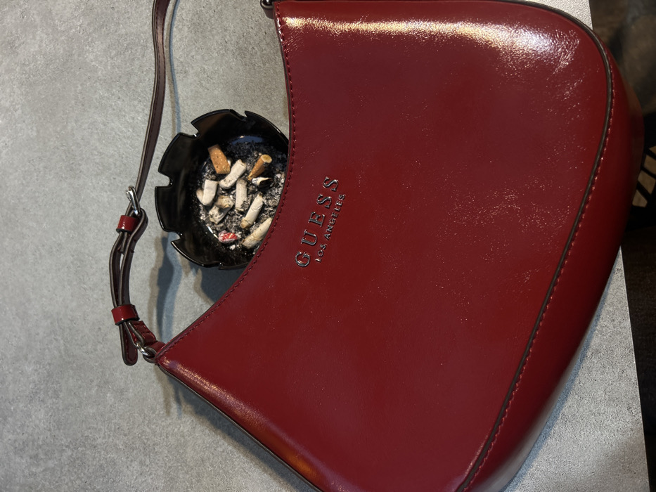 The image displays a red, glossy shoulder bag, branded "GUESS LOS ANGELES" with silver lettering, positioned on a light grey, textured surface. To the right and partially obscured by the bag, a black ashtray containing multiple cigarette butts and ash is visible. The scene is located in Thirroul, Australia. No individuals are present.